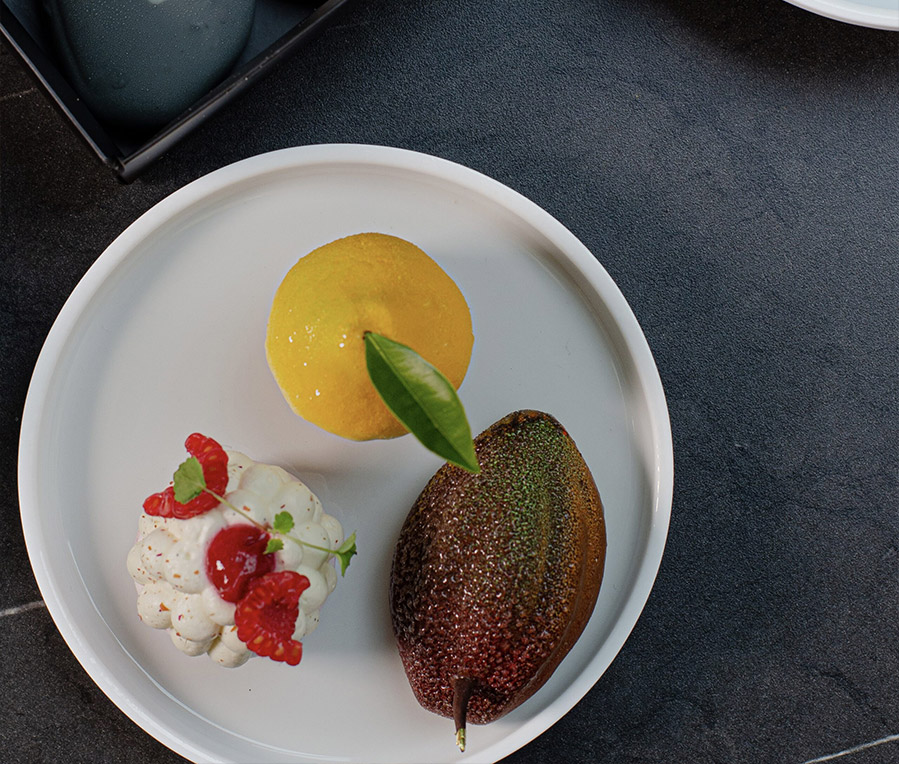 2 yuzu : Pâte sablée, Crème d'Amande, Crème légère yuzu, Marmelade de citrons confits et menthe ciselée