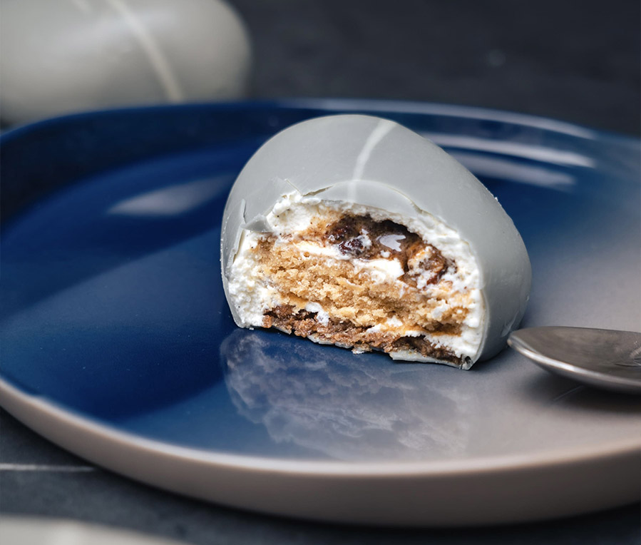 Biscuit moelleux vergeoise, croustillant sablé, caramel fleur de sel, praliné pécan, ganache montée vanille.