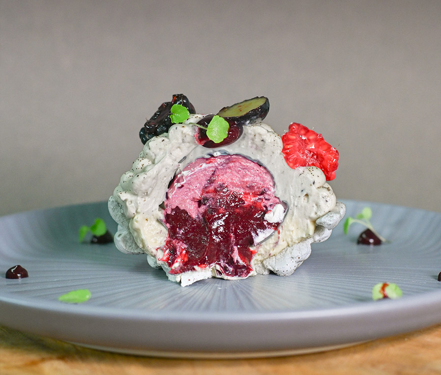 Coque meringuée, crème légère vanille, Crémeux fruits noirs, crème fouettée mascarpone vanille.