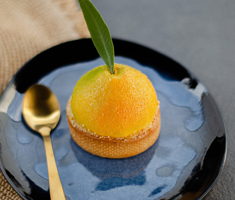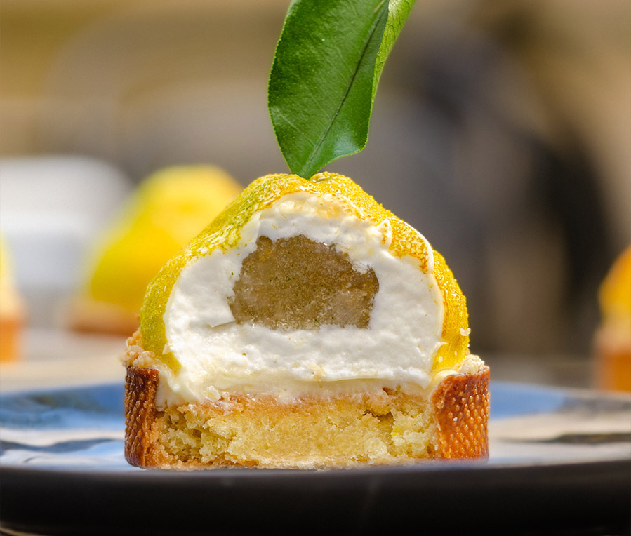 Pâte sablée, crème d’amandes bergamote, crème légère yuzu, marmelade de citrons confits et menthe ciselée.