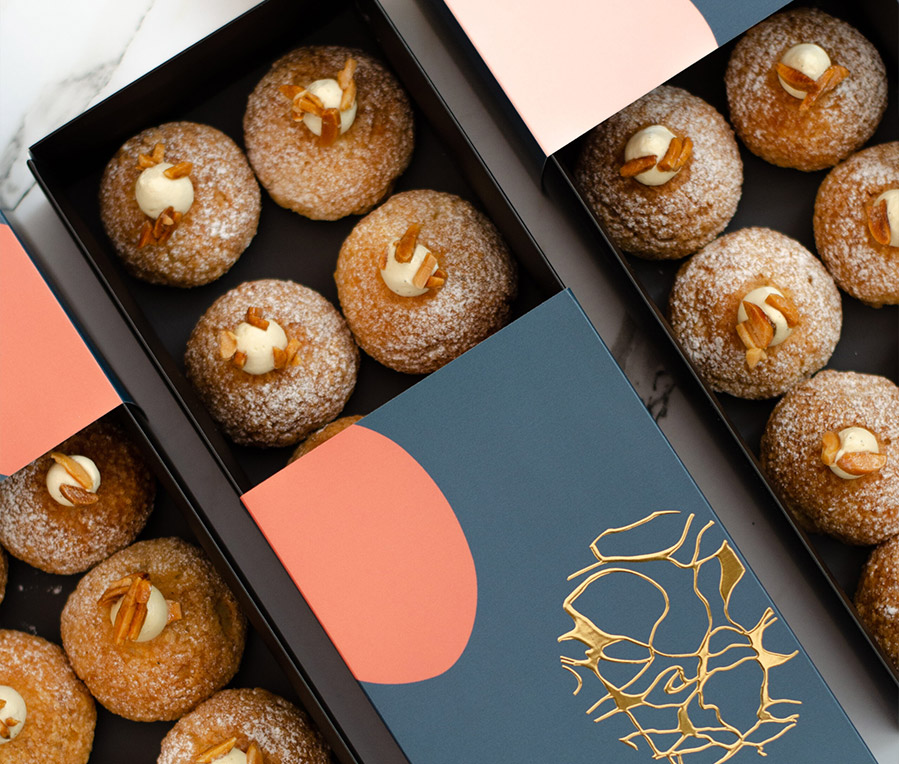 Ecrin de 10 petits choux à la vanille avec un coeur caramel.
